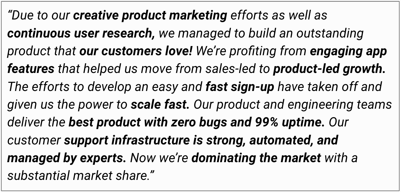 The UX and UI of your product will impact how you market it. A good marketing team will not focus on selling. It will focus on creating a demand. Therefore, it’s important to be involved as early as possible in the product development process (number 4). The development process depends also on your team members, which impacts hiring and personal development. As you can see, you can mix all six points into one headline of the value/outcomes-based version, “How our customers drive & enjoy.”