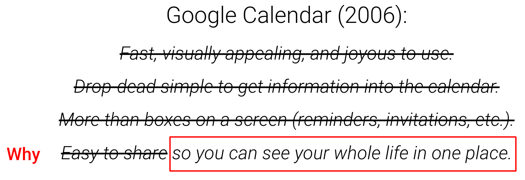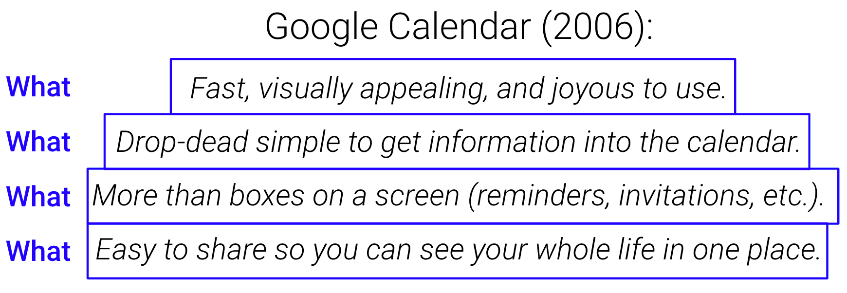 That was the product vision of the Google Calendar team back in 2006. Even though it’s “Google” I’d like to do the same analysis as we did before. What are the what(s) and why(s)?